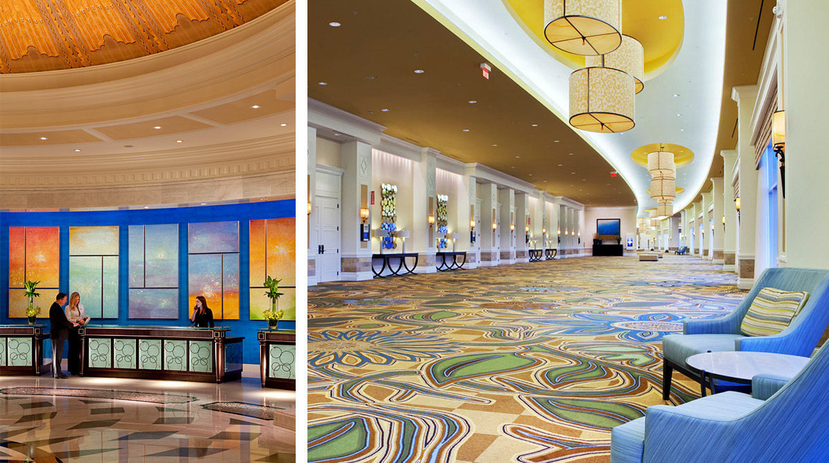 Dining options include a casual three-meal restaurant, casual bar, poolside grill, coffee shop and a lobby lounge. Dining areas are arranged so guests can take advantage of views of the pool area, lake and golf course from the outdoor balconies and patios. The two-story conference facility includes a 36,000 SF ballroom and a 27,000 SF ballroom, 59,000 SF of meeting rooms and nearly 30,000 SF of pre-function space. Interior Design services were provided by Duncan Miller Ullmann.