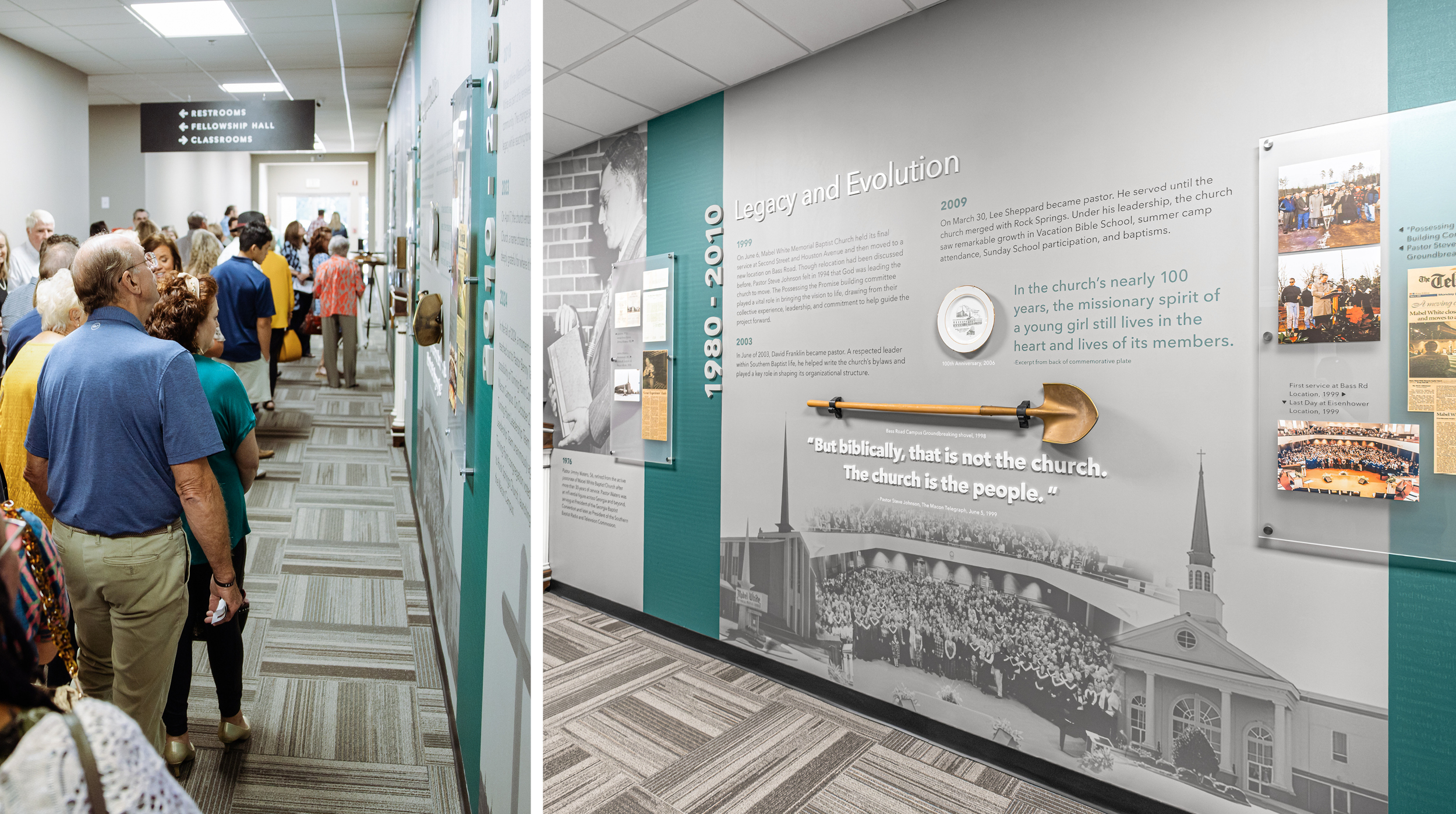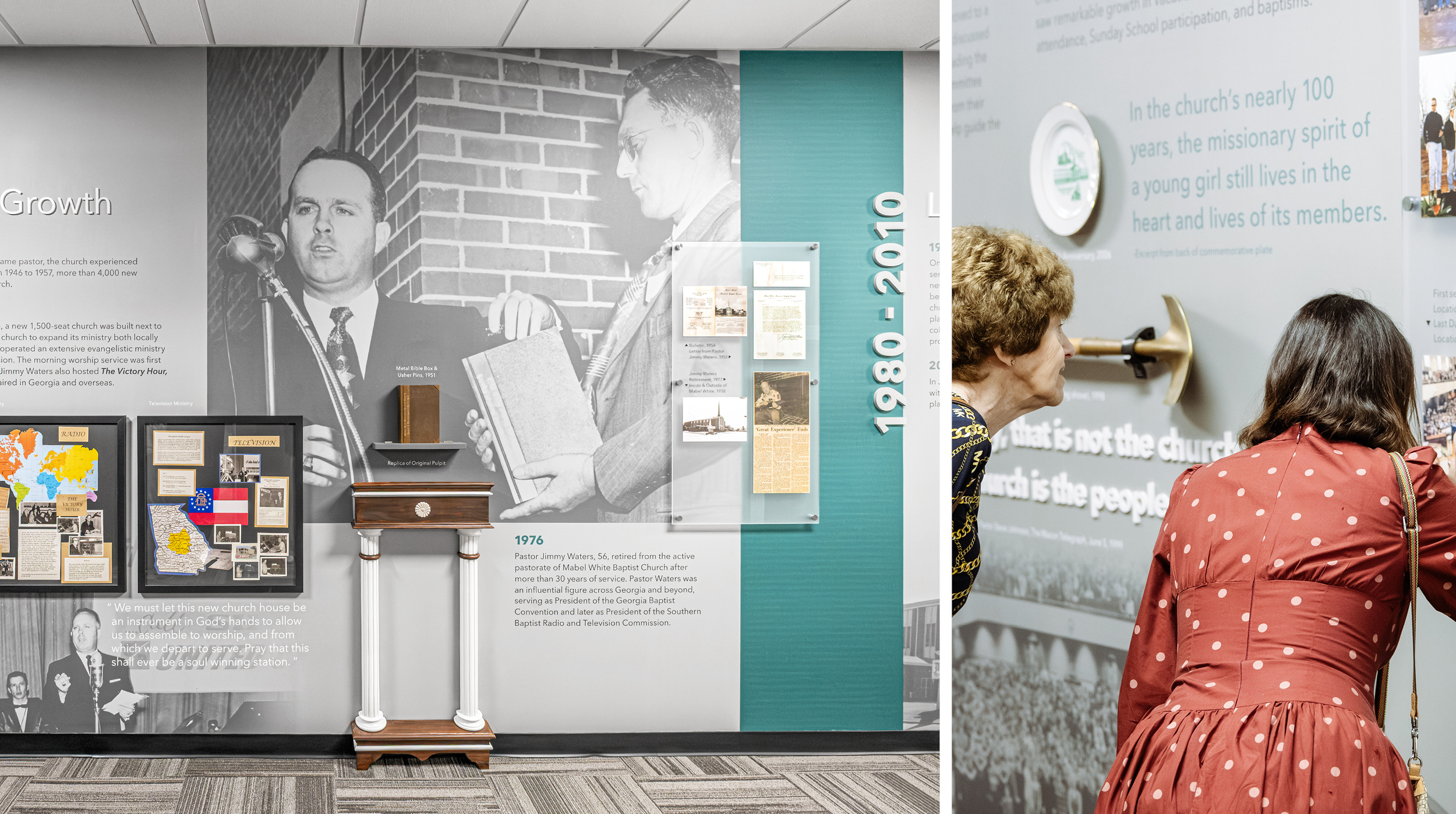 Smallwood teamed with the creative director of Rock Springs Church to bring this vision to life through the design of a 48-foot “Church Legacy Wall” at the Macon campus. The installation tells the story of Mabel White Memorial Baptist Church from its beginnings in 1900, highlighting moments of growth and the contributions of key figures who shaped the local ministry. With three-dimensional elements, narrative text, photographs, meaningful artifacts, and thematic ideation to establish visual and storytelling elements, the wall weaves together the legacy of the past with the mission and vision of Rock Springs Church today.