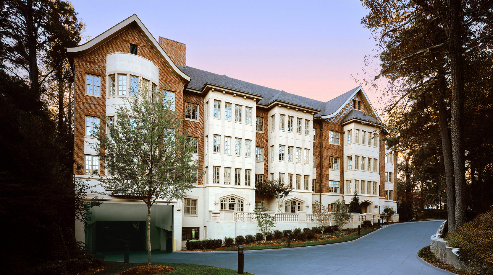 Maximizing the development potential of the site, the project respects the scale of the surrounding neighborhood near Emory University and was kept to a height of four stories by spreading out the floor plan. Due to the Owner’s commitment to being compatible with the context of the historic district, and in cooperation with the North Druid Hills Civic Association, The Clifton emulates an English Arts and Crafts mansion. The building’s exterior is faced in traditionally detailed red brick over a rusticated cast stone base featuring Tudor style balustrades, with door and window surrounds. The street facade is articulated with bow windows, projecting square bays and gables to incorporate traditional features of the English style. The mass of the building is broken into the main building fronting North Decatur Road, and a wing which extends back toward the rear of the property.