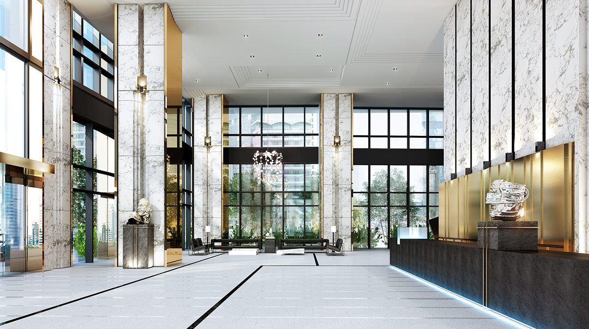 The design for the public areas of all three office towers located in the landmark District 8 development, required a grand statement punctuate the lobbies of this global headquarters center. High end contemporary design using Arabescato marbles, polished brass and warm timbers provide a fresh and rich interior. Black stone underlines and highlights the crisp, modern volumes, in a striking homage to Italian Architect Carlo Scarpa. The stepped stone elements and rich tones help transition to the other public areas and elevator lobbies. Harkening back to an earlier period, the contemporary design provides a truly timeless interior.